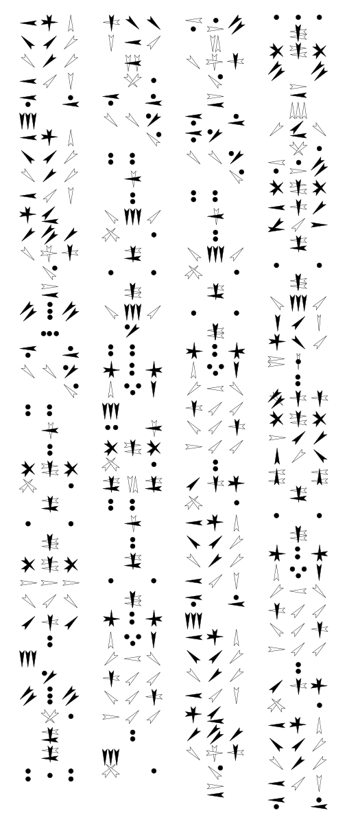CTS characters are composed of three kinds of 'strokes': light strokes (relatively shallow wedges), dark strokes (noticeably deeper wedges) and dots (circle-ish, deeper than light strokes though often more shallow than dark strokes). Strokes other than dots can have 8 orientations (upwards, downwards, rightwards, leftwards, up-right, up-left, down-right and down-left); an upwards stroke and a downwards stroke are only distinguished by whether the 'pointy' side of the wedge is in its upper part or in the lower part. When representing CTS on paper or on a screen, it's conventional for humans to fill-in dark strokes while only the contour of the wedge is drawn for light strokes. The following are the CTS representation of the 18 chromemes presented above (all other glyphs found in a text can be safely assumed to be logograms):